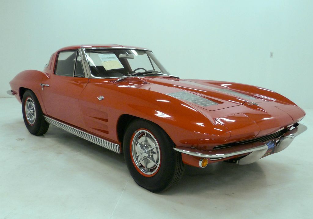 1003U..1963 Corvette Split Window Coupe, 327-340 hp, 4 speed, numbers matching original motor, transmission, and rear end, also has factory original body/trim tag. Riverside Red paint with Tuxedo Black interior. Body-on restored with very nice vibrant paint, interior, chrome but significantly the body has NOT been hit in the past and retains its original body panels. Recent February 2025 compression test at 150 lbs. per cylinder. Also has an affirmation by CCAS/Grenning as to the legitimacy and originality of the engine block, stamp pad, and the engine stamp. Prior owner kept this car in temperature and humidity controlled storage which is strong evidence of careful and considerate ownership. Optioned with T-10 transmission, 3.55 posi, Wonderbar radio, seat belts, hubcaps, and vintage 6.70x15" blackwall tires. Most all factory correct type components including the spare, jack, jack tools, washer system, shifter, shielding, air cleaner, #668 alternator, idler pulley, spark plug shields, hoses, hose clamps, #3721 carb, 6-quart oil pan, hood alignment blocks, valve covers, fuel filter, finned balancer, expansion tank, gas door assembly, Bowtie mirror, glove box door, cookie tin hood, owners manual, and sales brochure. Documented with the CCAS/Grenning Engine Stamp Affirmation. Production date of April 25th, 1963 and delivered new by Earl Evans Chevrolet in Painesville, OH (dealer code 164 in zone 28) per the official NCRS/GM Shipping Data Records (SDR). Today, the one-year only split window remains one of the most iconic designs in the history of the American automobile. Looks, runs, and drives excellent. CC:2 $169,000.00 *many more split window coupes located here