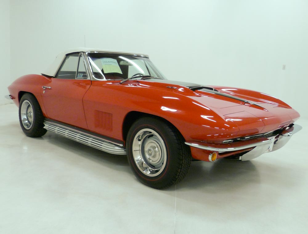 1027U..1967 Corvette Convertible, two tops, 327-300 hp, factory air, powerglide, numbers matching original motor, transmission and rear end with CCAS/Grenning Engine Stamp Affirmation, also has factory original body/trim tag, 73,121 actual miles. Ermine White paint with Rally Red interior and Black soft top. Very rare and desirable color combination especially with the documented options. Body-off restored in excellent show condition. These type restorations normally cost between $125,000.00 to $150,000.00. Optioned with factory air, powerglide, power steering, power brakes, power windows, telescopic, speed warning, black vinyl auxiliary hardtop, 3.36 rear, SS brakes, AM/FM radio, tinted glass, B.O. aluminum wheels, and red stripe radials. A/C retrofitted to R-134A. Most all factory correct type components including the spare, seat belts, washer system, shifter, shielding, air cleaner, spark plug shields, hoses, hose clamps, expansion tank, radiator, gas door assembly, glove box door, owners manual, sales brochure, and T-3 headlights.