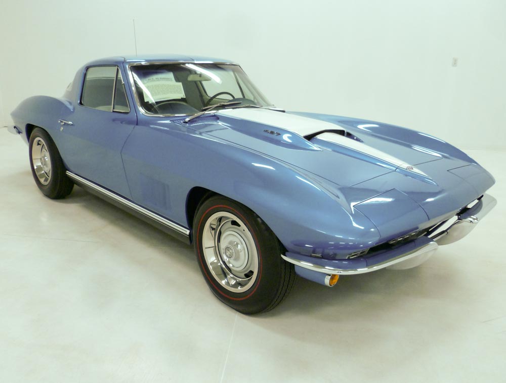 1028U..1967 Corvette Duntov Coupe, 427-390 hp, factory air, powerglide, numbers matching original motor, transmission and rear end. Also has factory original body/trim tag. Marina Blue paint with White stinger and White/Blue combo interior. Rare and desirable color combination. Body-off restored! Multiple NCRS Top Flight awards (7), NCRS PV'd (Performance Verified), NCRS Duntov Mark of Excellence award, Bloomington Gold certified, and the Vette Fest Triple Crown award. Optioned with factory air, powerglide, power steering, power brakes, power windows, shoulder harness, positraction, SS brakes, AM/FM radio, tinted glass, rallys, and 7.75x15" red stripe tires. Most all factory correct type components including the spare, jack, jack tools, seat belts, washer system, shifter, shielding, braided wires, air cleaner, alternator, distributor, hoses, hose clamps, window glass, valve covers, starter, carb, exhaust shields, radiator, gas door assembly, glove box door, warranty book, owners manual, sales brochure, and T-3 headlights. Documented with the NCRS/GM validated tank sticker (build sheet), dealer invoice, warranty book/P.O.P., owners manual packet, owner history, NCRS confirmation of Judging awards, judging awards, certificates,and judging sheets. Also noted is that this car was a factory delivery at the St. Louis Plant. Looks, runs, and drives excellent. CC:1 $249,000.00